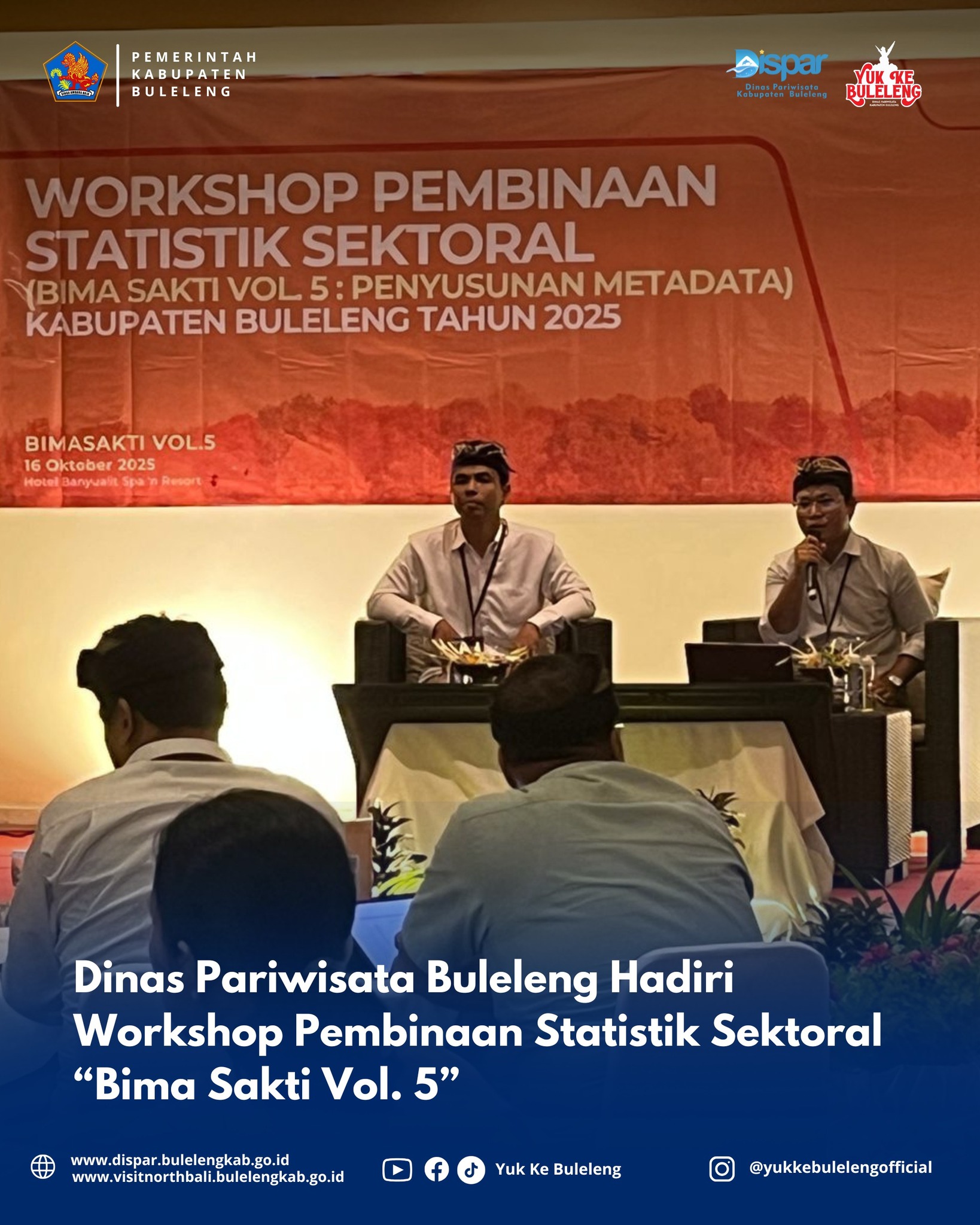 Singaraja, 16 Oktober 2025 – Perwakilan Dinas Pariwisata Kabupaten Buleleng menghadiri Workshop Pembinaan Statistik Sektoral (Bima Sakti Vol. 5): Penyusunan Metadata yang diselenggarakan oleh Badan Pusat Statistik (BPS) Kabupaten Buleleng, bertempat di Banyualit Spa & Resort.