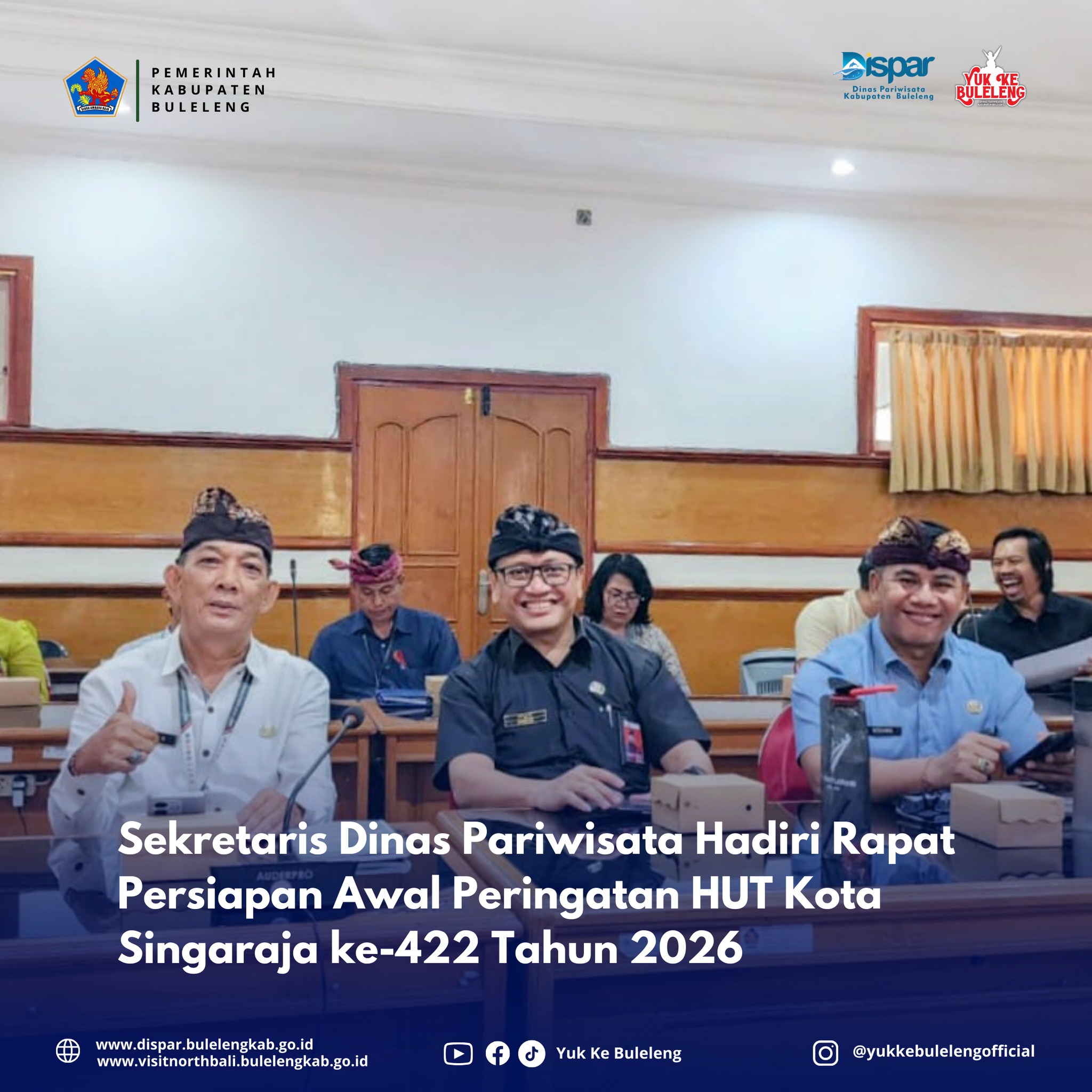 Singaraja, Kamis (29/1/2026) — Sekretaris Dinas Pariwisata Kabupaten Buleleng Ariston Adhi Pamungkas, S.P., M.Env.Man, menghadiri rapat persiapan awal rangkaian Peringatan Hari Ulang Tahun (HUT) Kota Singaraja ke-422 Tahun 2026 yang dilaksanakan di Ruang Rapat Unit IV Kantor Bupati Buleleng. Rapat ini dipimpin oleh Asisten Pemerintahan dan Kesejahteraan Rakyat Setda Kabupaten Buleleng serta dihadiri oleh perwakilan perangkat daerah terkait, perwakilan kecamatan se-Kabupaten Buleleng, dan beberapa pengurus daerah cabang olahraga (pengda cabor).