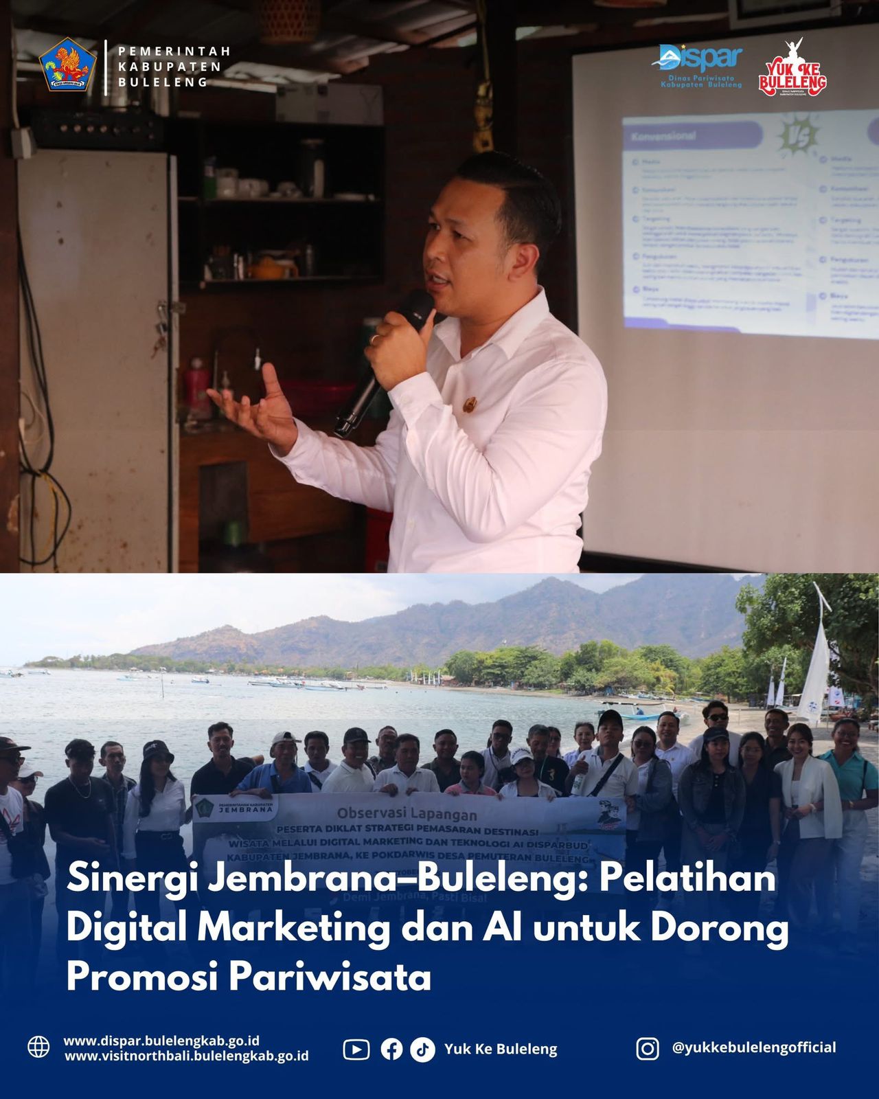 Pelatihan tersebut diselenggarakan pada Rabu, 22 Oktober 2025, bertempat di Ode Resto, Desa Pemuteran, Kecamatan Gerokgak, Buleleng. Kegiatan ini menghadirkan para pelaku pariwisata dan ekonomi kreatif dari Kabupaten Jembrana yang antusias mengikuti materi seputar strategi promosi digital dan pemanfaatan teknologi modern untuk mendukung pengembangan destinasi wisata di daerah mereka.