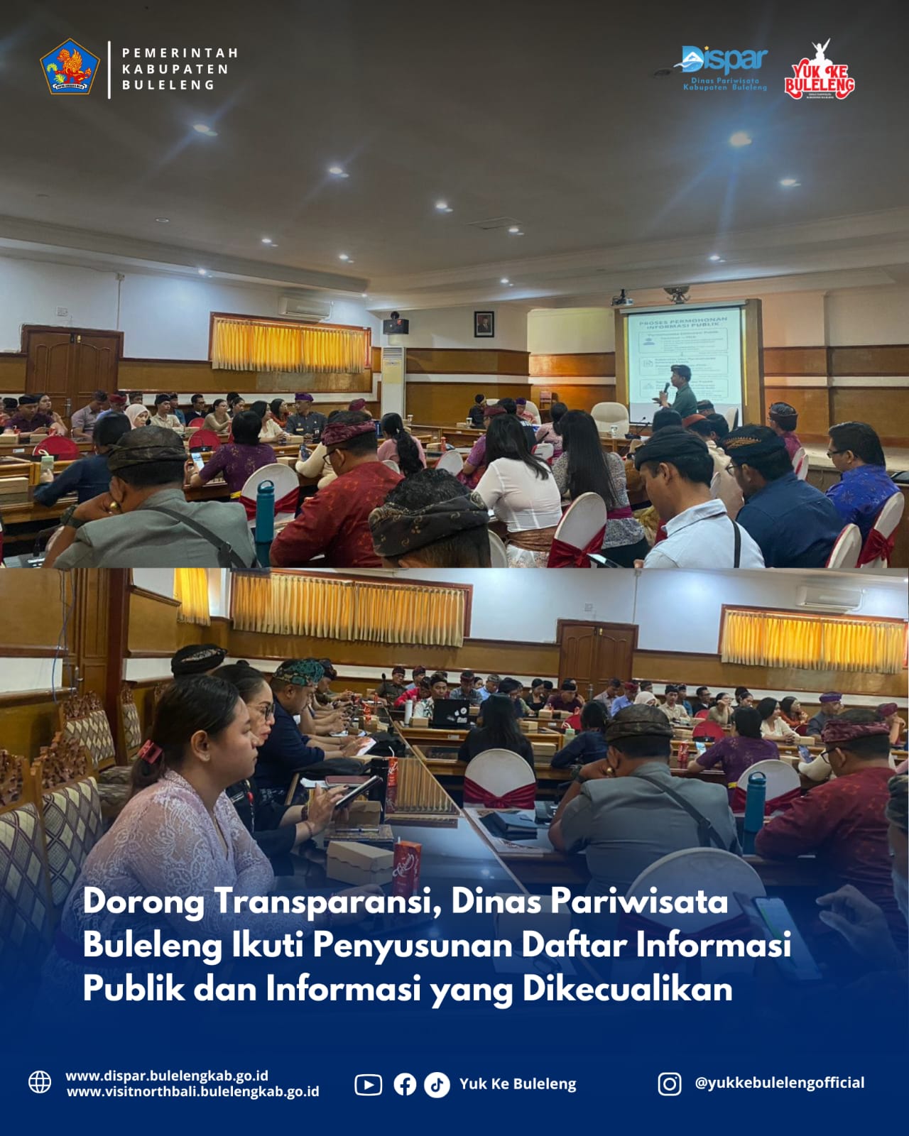 Singaraja, 25 September 2025, Dinas Pariwisata Kabupaten Buleleng melalui Adyatama Kepariwisataan dan Ekonomi Kreatif Ahli Madya, Elisabet Maria Parinussa, ST, mengikuti kegiatan Penyusunan Daftar Informasi Publik (DIP) dan Daftar Informasi yang Dikecualikan (DIK) yang dilaksanakan di ruang rapat Unit Kantor Bupati Buleleng.