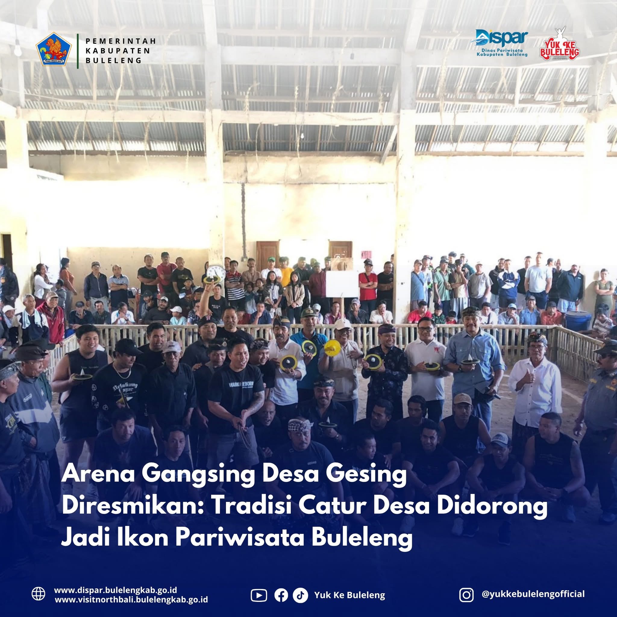 Buleleng, 20 November 2025 - Sekretaris Dinas Pariwisata Kabupaten Buleleng, Ariston Adhi Pamungkas, S.P., M.Env.Man, mewakili Kepala Dinas Pariwisata menghadiri peresmian Arena Gangsing di Desa Gesing, Kecamatan Banjar. Hadir dalam kesempatan ini Kelian Desa Adat Gesing, Camat Banjar, anggota DPRD Prov. Bali Gede Harja, Perkebel Gesing, Munduk dan Gobleg, LPM dan BPD Gesing, Pokdarwis, serta Babinsa dan Bhabinkamtibmas.
