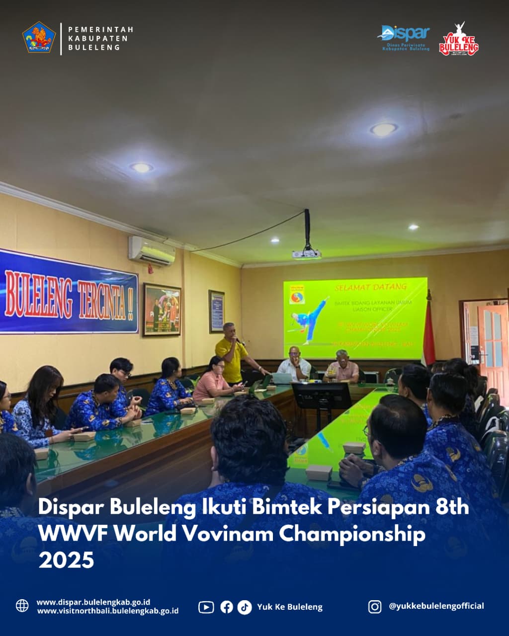 Dalam kesempatan ini Dinas Pariwisata Kabupaten Buleleng gencar melakukan persiapan menyambut perhelatan akbar olahraga internasional, 8th WWVF World Vovinam Championship 2025. Sebagai langkah pemantapan, Dispar menggelar Bimbingan Teknis (Bimtek) bagi sumber daya manusia yang akan bertugas sebagai garda terdepan dalam pelayanan tamu negara.