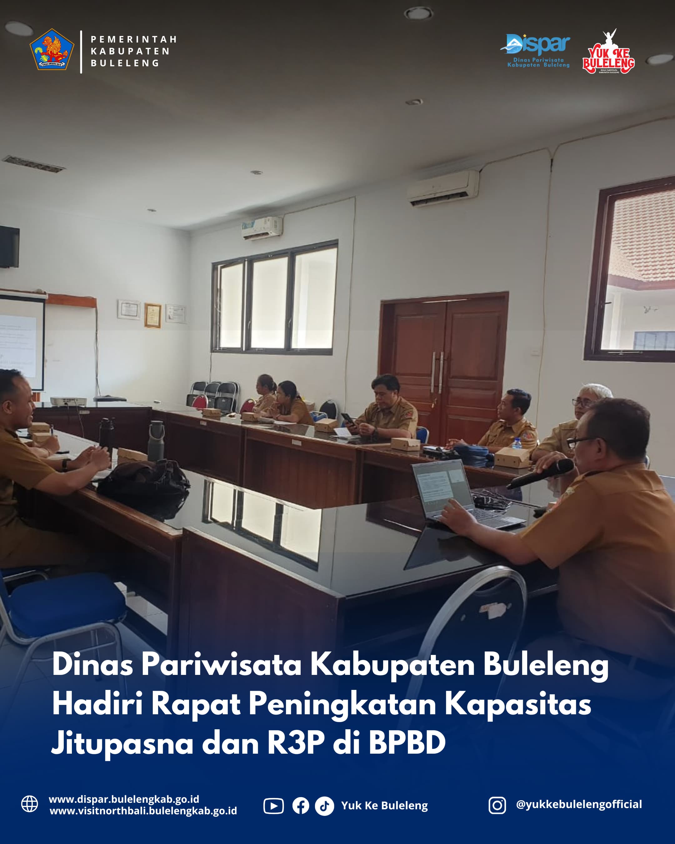 Buleleng, 13 Oktober 2025 — Dinas Pariwisata Kabupaten Buleleng menghadiri rapat yang diselenggarakan oleh Badan Penanggulangan Bencana Daerah (BPBD) Kabupaten Buleleng. Rapat tersebut membahas peningkatan kapasitas terkait Pengkajian Kebutuhan Pasca Bencana (Jitupasna) dan Rencana Rehabilitasi dan Rekonstruksi Pasca Bencana (R3P), bertempat di kantor BPBD Kabupaten Buleleng.