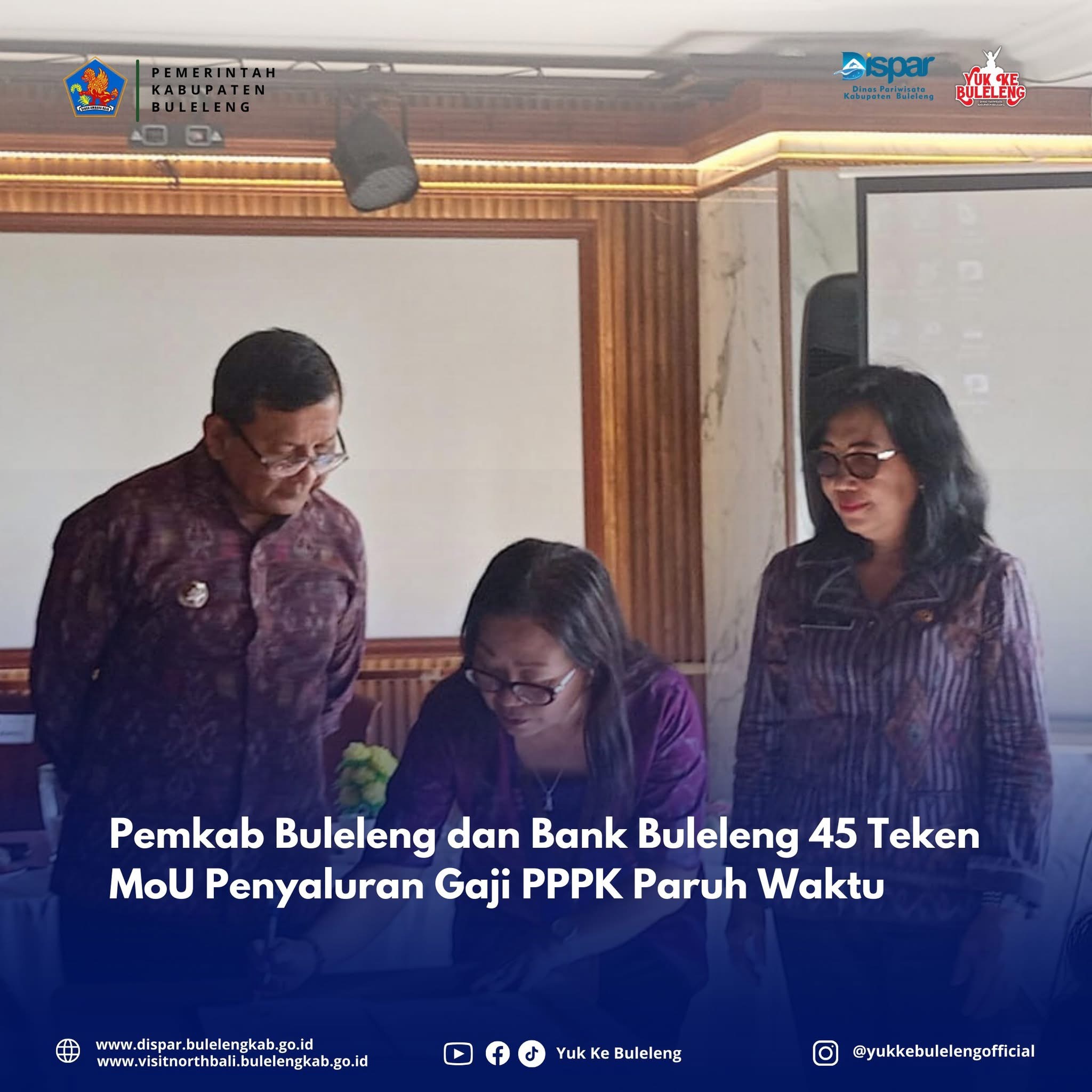 Selasa, 25 November 2025, Sekretaris Dinas Pariwisata Buleleng Ariston Adhi Pamungkas, S.P., M.Env.Man, bersama dengan Bendahara Pengeluaran menghadiri Penandatanganan MoU dan PKS antara Pemkab Buleleng dengan PT. BPR Bank Buleleng 45 (perseroda) mengenai penyaluran gaji PPPK Paruh Waktu lingkup Pemkab Buleleng melalui Bank Buleleng 45. Penandatanganan dilaksanakan di B'dlodd Resto, Penarukan. Hadir pada kesempatan kali ini, Bupati Buleleng, dr. I Nyoman Sutjidra, Sp.OG, Sekda Buleleng Drs. Gede Suyasa, M.Pd, pimpinan dan perwakilan perangkat daerah, camat, kabag, bendahara lingkup pemerintah kabupaten Buleleng.