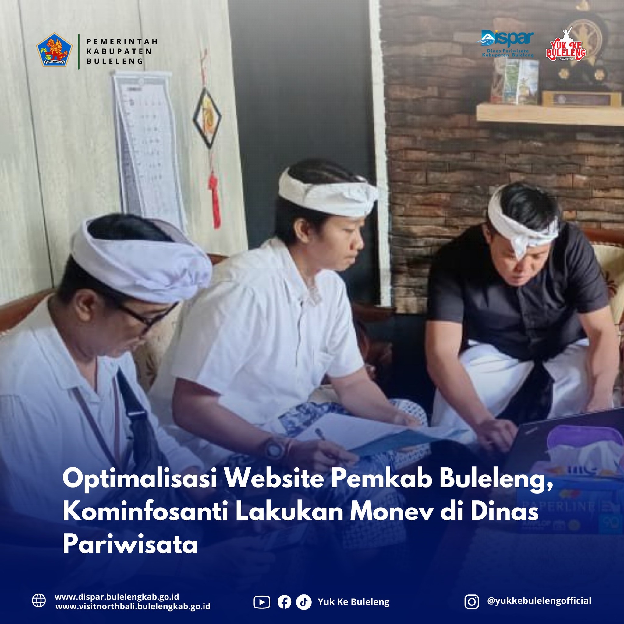 Kegiatan monitoring dan evaluasi tersebut dilakukan langsung oleh Tim Monitoring dari Dinas Kominfosanti Kabupaten Buleleng dan diterima oleh Adyatama Kepariwisataan dan Ekonomi Kreatif Ahli Muda Dinas Pariwisata Kabupaten Buleleng, Elisabeth Maria Parinussa, ST, bersama staf pengelola website. Dalam kesempatan tersebut, tim melakukan pengecekan menyeluruh terhadap pengelolaan, pengisian, serta pembaruan konten website resmi Dinas Pariwisata.