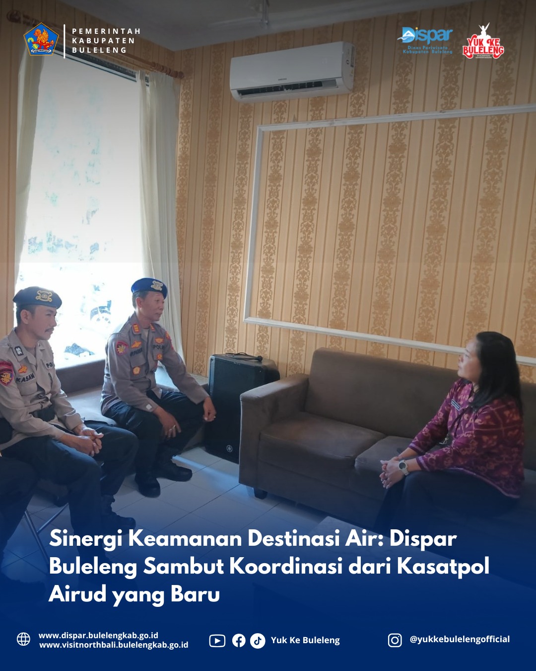 Buleleng 7 oktober 2025– Dinas Pariwisata (Dispar) Kabupaten Buleleng memperkuat sinergi dengan aparat keamanan guna menjamin keselamatan wisatawan di destinasi air. Kepala Bidang Destinasi Dispar Buleleng Ni Luh Made Enny Widiastuty, S.STP., M.H pada hari ini menerima kunjungan kerja dan koordinasi dari Kepala Satuan Polisi Perairan dan Udara (Kasatpol Airud) Buleleng AKP Putu Parnaya