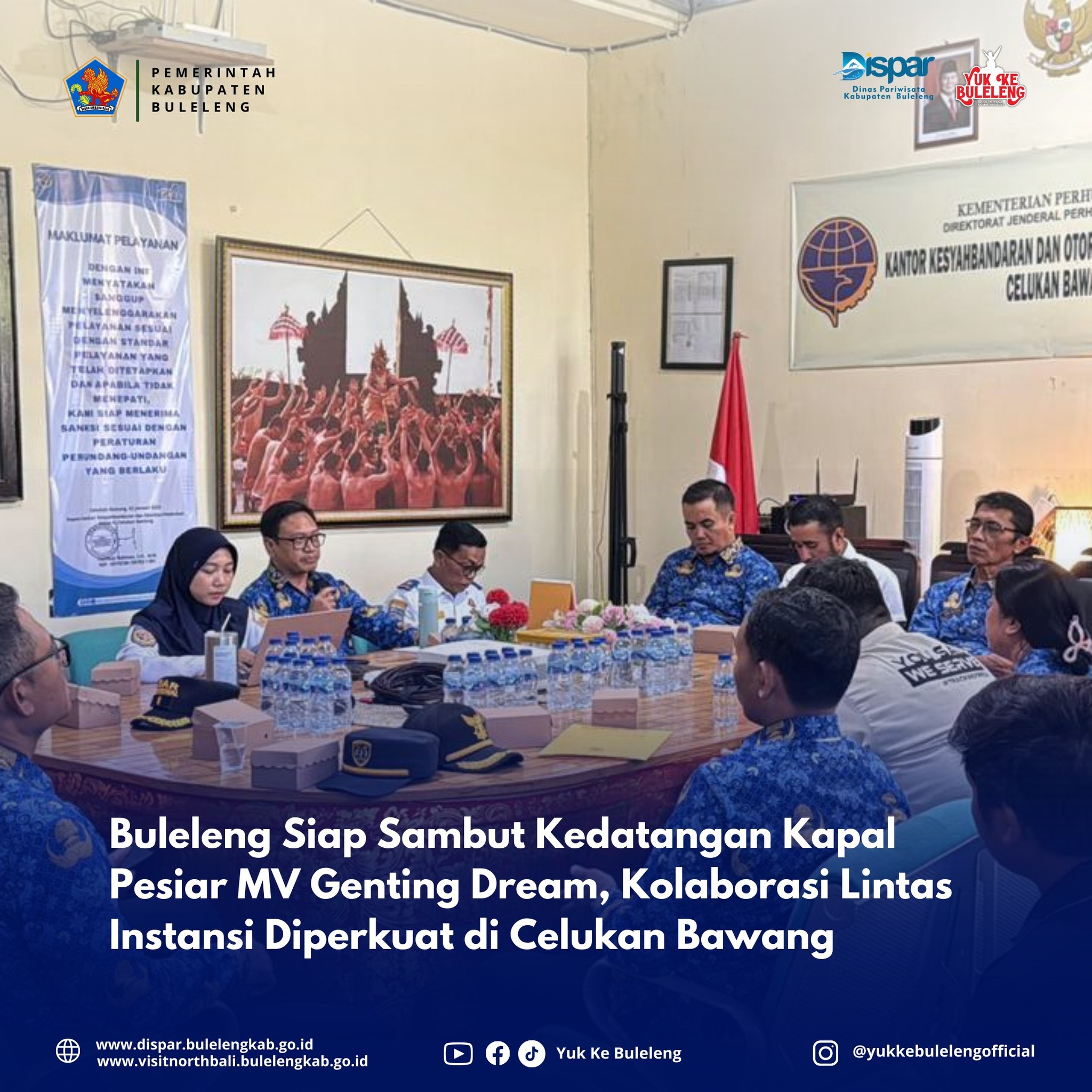 Persiapan Kedatangan Kapal Pesiar MV. Genting Dream di Ruang Rapat KSOP Celukan Bawang, Gerokgak. Hadir GM. PT. Pelindo Celukan Bawang, Kepala KSOP, Satuan Polairud, Agen Kapal Pesiar PT. Tracx, PT. Tajri, Tour Agen Intercruises, Sekcam Gerokgak, Dinas DagperinkopUKM, Dispar, dan para undangan lainnya.