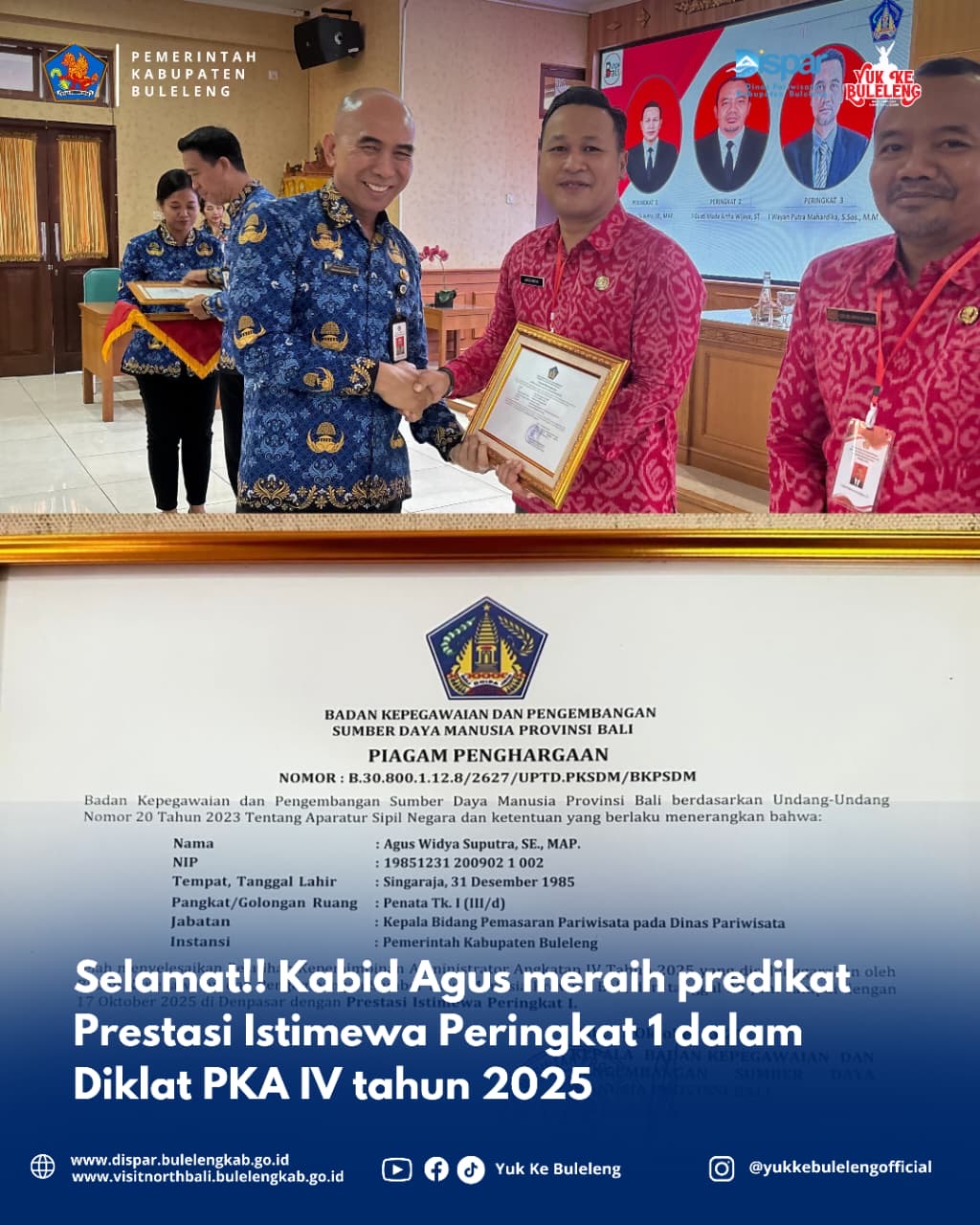 Singaraja, 17 Oktober 2025 — Prestasi membanggakan kembali diraih oleh Dinas Pariwisata Kabupaten Buleleng. Kepala Bidang (Kabid) Pemasaran Pariwisata, Agus Widya, berhasil meraih Predikat Prestasi Istimewa Peringkat 1 dalam Pendidikan dan Pelatihan Kepemimpinan Administrator (PKA) IV Tahun 2025.