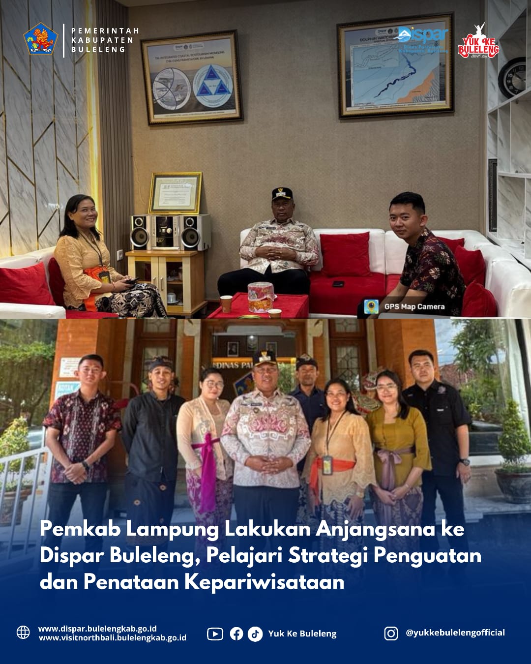 Singaraja, 16 Oktober 2025 - Dalam upaya memperkuat program kepariwisataan serta melakukan penataan sektor pariwisata di daerahnya, Pemerintah Kabupaten Lampung Tengah melakukan kunjungan kerja (anjangsana) ke Kabupaten Buleleng, Bali. Kegiatan ini bertujuan untuk melakukan koordinasi dan berbagi pengalaman (sharing session) terkait strategi pengembangan destinasi wisata, kebijakan pengelolaan pariwisata, peningkatan kualitas layanan, promosi, pemasaran, serta penguatan kelembagaan dan kapasitas sumber daya manusia di bidang pariwisata.
