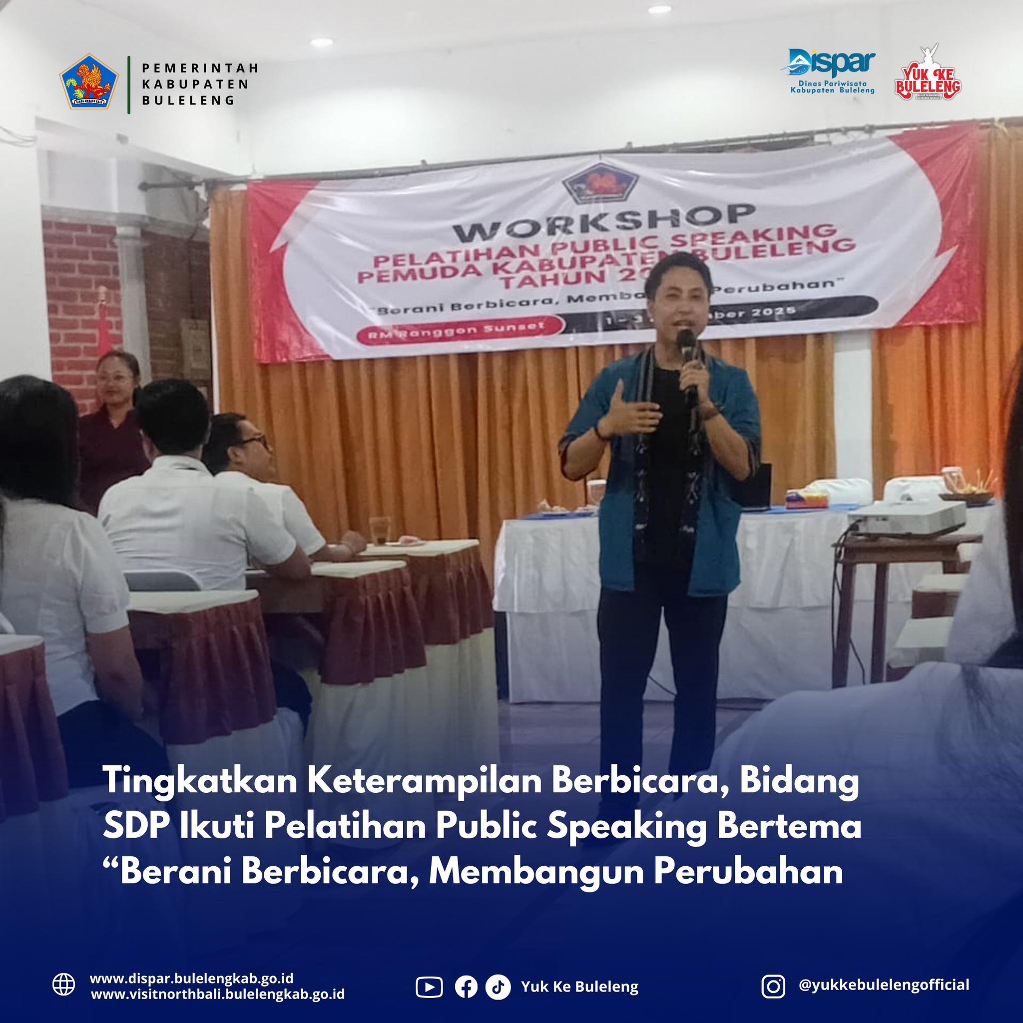 Rabu, 3 Desember 2025 – Perwakilan dari Bidang Sumber Daya Pariwisata (SDP) Dinas Pariwisata Kabupaten Buleleng mengikuti Pelatihan Public Speaking Pemuda Kabupaten